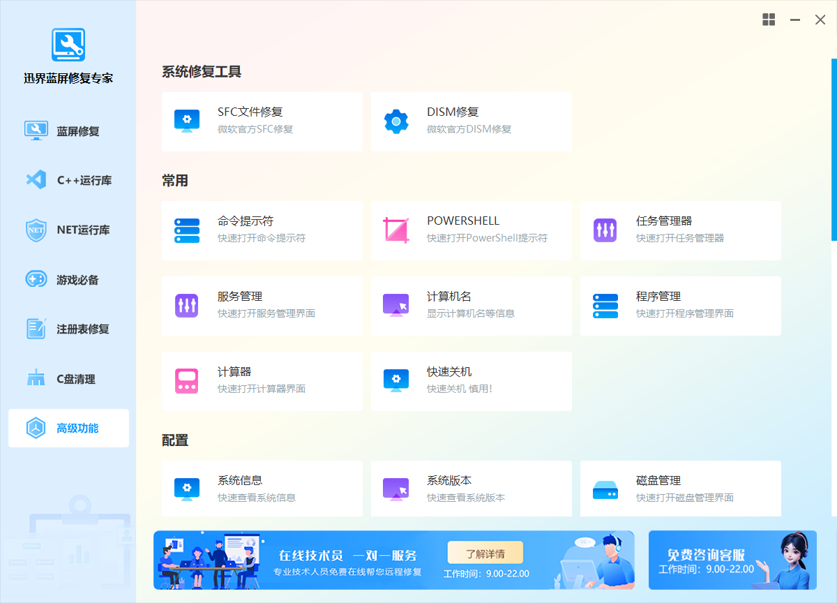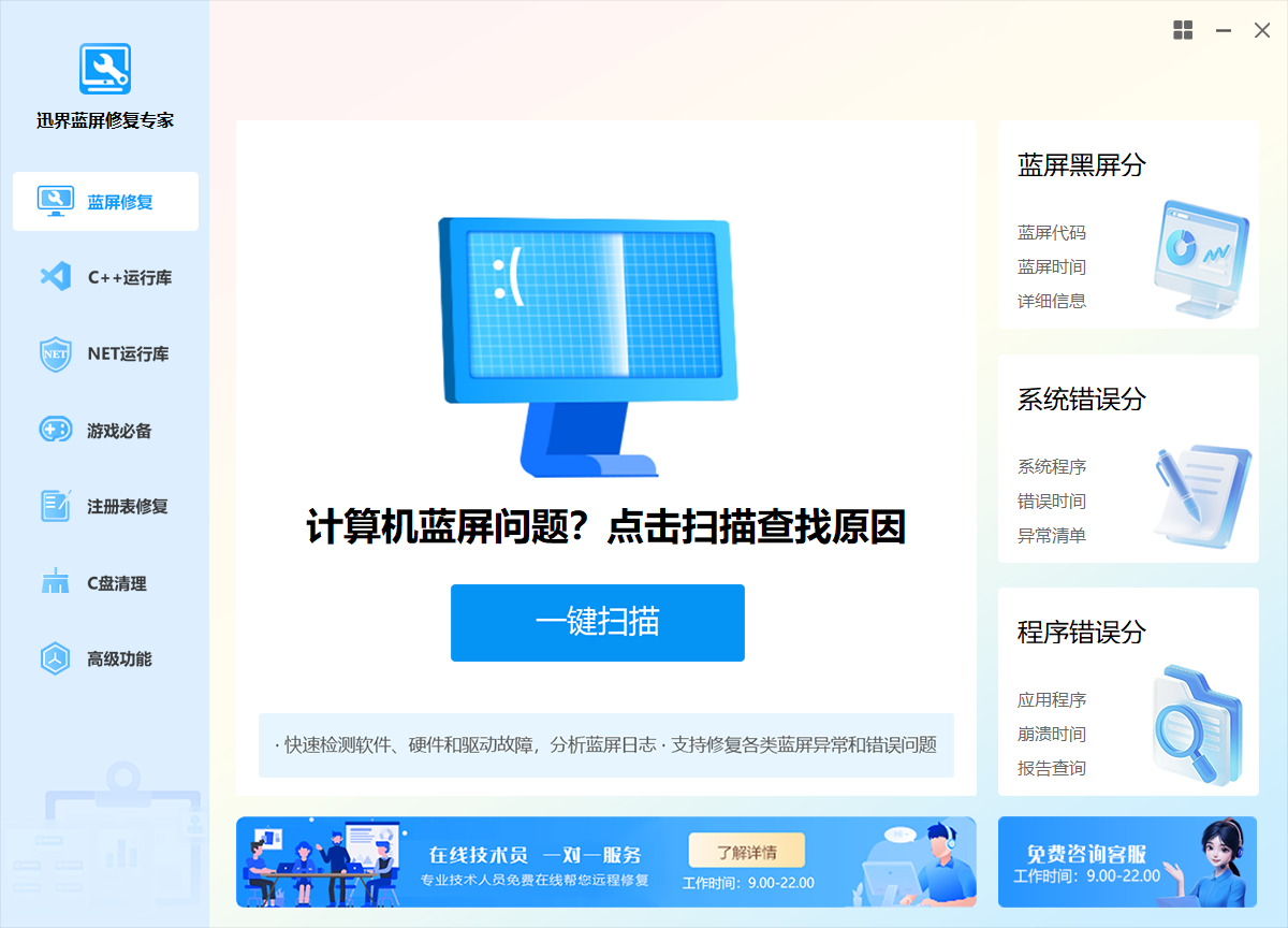 详细功能介绍:自动扫描系统蓝屏日志,精准定位软件冲突、驱动异常、硬件故障等根源问题。